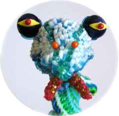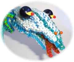 • Take two blue already added strands as weave strand. Use two White for the knots. • 1 Straight • Add in 1 Straight 2 new White • 1 Straight • Add in 1 Straight the 2 White and the 2 glitter Green. • Add in 1 Straight 2 new White on both sides. • 1 Straight • Add in 1 Straight 2 new White on the sides. • Add in 1 Straight the metal strand from the upperside off the head. The upper and underside off the head are now connected. • From this point the technical sequence off the upper side and the underside off the head should be followed parralel. • The weave threads which are used at the Upperside are now used for the Underside and the other way round. You keep on doing this for the next 6 knots. The easy way is to knot 1 knot on the Upperside then on the Underside and then again on the Upperside and so in..................... • 4 Straight• 1 Straight • Cut away 4 ends. • 3 Straight • Cut away 2 ends. • 1 Straight • Cut away 2 ends. • 3 Straight • Cut away 2 ends Glitter green. • 4 Straight • Cut away 2 ends. • 3 Straight • Cut away alle the strands left. • The underside off the head is finished.. |