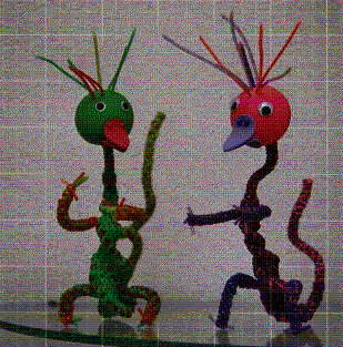 Stap 1 We beginnen door een knoop te leggen in 4 touwtjes (2 groen glitter, 1 geel en 1 groen). Deze knoop halen we er later weer uit. Dan steek je het ijzerdraad in het midden van de 4 touwtjes (zie foto 1) en knoopt om het ijzerdraad heen met de ronde knoop. Zorg dat de ijzerdraadjes van de snor in het donkerpaarse touwtjes geschoven zijn. Stap 2 Knoop met een ronde knoop met 4 uiteindes ongeveer 5 cm. Voeg nu 2 groene glitter touwtjes toe. Eerst 1 en daarna nog 1. Knoop nu 2 ronde knopen. Leg nu een glitter groen touwtje dubbel in de breedte over de knoop met een stukje ijzerdraad van ongeveer 6 cm, zodat aan beide kanten 2 uiteindes en een stukje ijzerdraad hangt. Hier worden later de armpjes mee geknoopt. Knoop nu met de 8 uiteindes nog ongeveer 4 cm. Voeg nu 4 groene glitterdraden toe, 1 voor 1. Na elke toegevoegde draad is het beste een knoop te maken alvorens de volgende toe te voegen. We knopen nu met 16 uiteindes. Knoop nog ongeveer 3,5 cm. Nu leggen we weer een glitter groen touwtjes dubbel in de breedte over de knoop met een stukje ijzerdraad van ca 10 cm, zodat aan beide kanten twee uiteindes hangen en een stukje Ijzerdraad. Hier worden straks de beentjes aangeknoopt. Zorg dat de beentjes recht onder de armpjes komen. Dit kun je een beetje bijdraaien als het niet het geval is. Knoop nu nog ongeveer 2,5 cm. Stap 3 Nu gaan we 4 groene glitters (8 uiteindes) minderen, knip het kortste touwtje zo kort mogelijk af, Maak na elke mindering 2 knopen en minder dan het volgende touwtje. Je houdt nu 8 uiteindes over, knoop hiermee nog ongeveer 4 cm rond. Minder dan opnieuw 2 touwtjes. Nu heb je 4 uiteindes. Knoop nu nog ongeveer 17 cm voor de staart. Wij hebben hier nog wel een groene en een gele en een glittergroen touwtje toe moeten voegen. Als de draadjes eerder op zijn, kun je ook eerder stoppen. In dat geval wordt de staart korter. Knip nu het ijzerdraad zo kort mogelijk af en maak nog een paar knopen. Mooi is ook als je de uiteinde nog ongeveer 3 cm met 3 uiteindes rond knoopt. Stap 4 Neem nu 2 groene touwtjes en knip die door het midden. Met elke helft kan je dan een armpje of beentje knopen (zie foto hiernaast). Knoop nu de armpjes om het ijzerdraad ongeveer 2,5 cm, knip het ijzerdraad zo kort mogelijk af en maak dan nog 2 knopen zodat je het ijzerdraad niet meer voelt. Knip de uiteindes op een halve cm af, om het idee van handjes te krijgen. De beentjes knoop je ook om het ijzerdraad zo ongeveer 4 cm. Knip dan het ijzerdraad kort af en maak nog twee knopen. Knip ook deze uiteindes af op een halve cm om zo voetjes te maken. Stap 5 Nu maken we het hoofdje. Schuif een kraal om de 4 touwtjes en plak de kraal vast (foto 4). Maak met de 2 eivormige foam stukjes een snavel en plak die op de kraal zoals op foto 5. Steek nu zoveel mogelijk korte stukje van de touwtjes in de kraal. Laat een paar druppen goede lijm in het gat druppen, om zo de haartjes vast te zetten. Goed laten drogen. Plak oogjes op de kraal en de draak is klaar! Nu nog alleen in de goede vorm buigen |