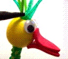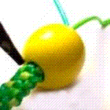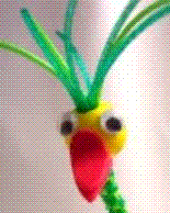 De beschrijving heb ik van yoarra.nl. Hiervoor gebruiken we de volgende technieken: knopen om ijzerdraad, draden toevoegen, met 16 uiteindes knopen, draden minderen. Door met buigzaam ijzerdraad in het midden te knopen, kan je de draak in de goede vorm buigen. Voor de draakvogel hebben we 14 touwtjes, in verschillenden kleuren (ik heb 10 groen glitter 3 groen en 2 geel gebruikt. Benodigdheden: 14 touwtjes, Een stukje buigzaam ijzerdraad van ca 40 cm. Een grote kraal, 2 eivormige foam stukjes en twee oogjes. |