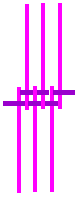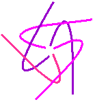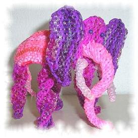 | Head | • The face needs 7 strands and you need 8 strands for each ear. Tha t makes a total 23 strands • Start the face with 3 strands 2 Purple and 1 glitter purple as weave strand. (Figure E) • Add 2 purple in 1 straight. • Add 2 purple in 1 straight. • 2 straight. • Start the ears separately. Start the ear with 3 strands 2 Purple and 1 transparent purple as weave strand. (Figure E) • Add 2 purple in 1 straight. • Add 2 purple in 1 straight. • Add 1 purple in 1 straight. • 2 straight. • Join the 3 parts with the help of an metal strand wich you measure on your work, Total wideness off the face and the ears together. Knit with every part a lose knot and put the Metal strand in the center of the knot and pull the it tightly. • In the next straight knot you use the weave strands which are on the outside off the ears as weave strands. All the other weave strands us use as normal knoting strand. • 1 straight. • Know you start with putting the nose strands trough the face. Use the pattern in the figure F • Put 1 strand throug in 1 straight • Put 2 strand throug in 1 straight • Put 4 strand throug in 1 straight on every location youpu 2 strands throug. • Put 2 strand throug in 1 straight • Put 1 strand throug in 1 straight • 1 straight . • Cut away in both ears the 2 middle strands. Add 4 strands off Pearl on both side 2 off the nose for the tooth. • Pull all the strands off the nose tightly. The head should be tightly on the body before you continue with the rest off the elephant. • In 1 straight knot the metal strands off the tooth can be put through • The ears and the face are seperatd again.Choose 4 ends ase weave strand on the border off face and ears. Use the discipyion off joining in reverse order. • Continue face: • 1 straight.• Continue Ear: • Cut away 2 strands on the outside off the ear•Nose: For the nose you use the knot which is going round and round as you can see in the figure. • Start with 10 strands.•Tooth: • Use 6 strands for each tooth.• Legs: • 20 a 25 round Watch out each side goes in the oposite direction from the other side. |  Figure E  Figure F  Nose knot |