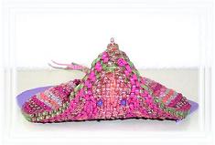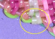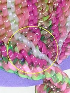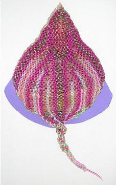 • As soon as a strand is on it's end, replace it with a new one. I didn't make notice off these moment because it depends on the tightness off the knot. •Start with the Iron strand and a short piece of Pink Scoubidou. Put the short scoubidou off 5 mm over the end off the iron strand.Start the first knot at 4 cm from the end. • Start with 1 Pink and 1 Green. take the green one at the end as 1 end and the pink in the middel so that you have 2 end. • Make 10 Round knots with 3 scoubidou strands. • Add in 1 Round 1 Green and put the end off the strand in so you knit with 4 strands. • 10 Round • Add in 1 Round 1 Purple in the middle. • 15 Round • Add in 1 Round 1 Glitter Purple in the middle. • 3 Round • Add in 1 Round 2 Pearl on both sides off the Glitter Purple 1 strand. In total 2 strands • 3 Round • Add in 1 Round 4 dark Purple on both sides off the Pearl strands 1 strand. In total 4 strands See Figure A • 3 Round • Add in 1 Round 4 Purple on both sides off the Pearl strands 1 strand. In total 4 strands • 3 Round • Add in 1 straight the second Iron strand exacktly in the middle in line of the weave strands. Put a purple strand over the Iron strand fo the color. • Add the new strands in a new fashion. At the sides off your work you start wright away with a straight knot. Keep the green weave strand a little loose so that there is room for this knot. See Figure B • Add in 1 Straight on both sides 1 Pearl. Use the knot in figure B. In total 2 strands. • 1 Straight • In 1 Straight on both sides 1 Purple. Use the knot in figure B. In total 2 strands. • 1 Straight • In 1 Straight on both sides 1 dark Purple. Use the knot in figure B. In total 2 strands. • 1 Straight • In 1 Straight on both sides 1 Purple. Use the knot in figure B. In total 2 strands. • 1 Straight • In 1 Straight on both sides 1 Pearl. Use the knot in figure B. In total 2 strands. • 1 Straight • In 1 Straight on both sides 1 Purple. Use the knot in figure B. In total 2 strands. • 1 Straight • In 1 Straight on both sides 1 Pearl. Use the knot in figure B. In total 2 strands. • 1 Straight • In 1 Straight on both sides 1 dark Purple. Use the knot in figure B. In total 2 strands. • 1 Straight • In 1 Straight on both sides 1 Glitter Purple. Use the knot in figure B. In total 2 strands. • 1 Straight • In 1 Straight on both sides 1 dark Purple. Use the knot in figure B. In total 2 strands. I cut away 4 ends because they where to short. • 3 Straight • Cut away the 4 Pearl ends in the middle. • 3 Straight • Cut away on both sides 2 purple ends wich are more to the inside. In total 4 ends See Figure C • 2 Straight • Cut away on both sides 2 Pearl. In total 4 ends • 2 Straight • Cut away on both sides 2 dark Purple. In total 4 ends • 2 Straight • Cut away on both sides 2 Purple. In total 4 ends • 2 Straight • Cut away on both sides 2 Pearl. In total 4 ends • Add in 1 Straight in the middle 1 Glitter Purple. • 1 Straight • Cut away on both sides 2 Purple. In total 4 ends • Cut away on both sides 2 Pearl. In total 4 ends • 2 Straight • Cut away on both sides 2 Purple. In total 4 ends • Cut away on both sides 2 dark Purple. In total 4 ends • 2 Straight • Add in 1 Straight in the middle 1 Glitter Purple. • Add in 1 Straight in the middle 1/2 Glitter Purple. • Add in 1 Straight in the middle 1/2 Glitter Purple. • 1 Straight • Cut away on both sides 2 Purple. In total 4 ends • 6 Straight • Cut away on both sides 2 dark Purple. In total 4 ends • 1 Straight • Cut away on both sides 2 Glitter Purple and cut away the iron strand on both sides. Not the one in the middle. In total 4 ends • 1 Straight • Cut away on both sides 2 dark Purple. In total 4 ends • 2 Straight • Cut away 2 Glitter Purple. • 1 Straight • Cut away 2 Glitter Purple. • 1 Straight • Cut away 2 Glitter Purple. • 1 Straight • Cut away 2 Glitter Purple. • 3 Straight • Cut the middle iron strand away on 5 cm from the scoubidou and put a piece off glitter Purple over the iron strand. • Cut away 2 dark Purple. • 1 Straight • Cut away 2 dark Purple. • 3 Straight • Cut away all the ends which are left. And cut the Iron strand 3 mm from the scoubidou. Cut the pins as shsort as you need them to put them in as the eyes at the underside. • To finish your ray cut the fins from the foam and put them with glue to the underside off the ray. Your Ray is finished. |